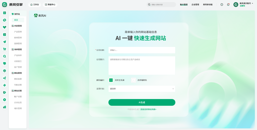 针对这一行业困境,乘风引擎AI建站以全链路AI技术为支撑,打破传统建站的固有模式,重点强化GEO核心能力,同时兼顾基础SEO适配,实现了“无需专业团队、无需复杂操作、几分钟快速建站”的便捷体验,为各类企业提供高效、可靠的数字化建站解决方案,真正赋能企业数字化转型落地。