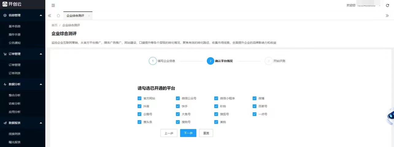 第二步,根据企业情况,勾选已开通的平台,系统全面检测网站情况,并给出检测结果及优化建议。从宣传推广的文章、视频、活动的更新时间、关注量、转发量、评论数等,搜集市场线索、互联网商机线索,投入低成本,找到适合企业的营销渠道和方式,实现精准营销。