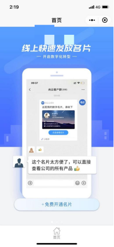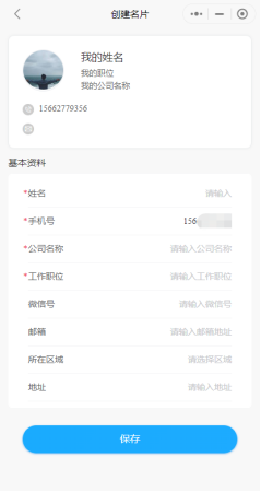 - 点击小程序首页的“免费开通名片”按钮,完善开通名片所需的基本资料信息,点击“保存”即可生成个人名片,如下图。