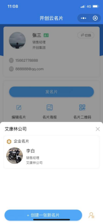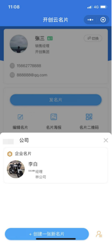 已开通一张个人名片的用户可在名片助手首页右上角的“切换”按钮弹窗内点击“创建一张新名片”,填写姓名、手机号、公司名称等基础信息后,点击保存即可创建一张新的名片(最多可创建五张免费的个人名片)
