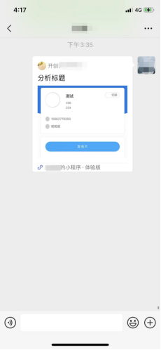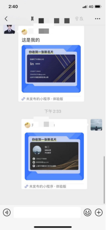 点击名片助手首页的“发名片”按钮或点击小程序顶部的“”内的分享小程序,均可分享个人名片至微信聊天窗口,如下图
