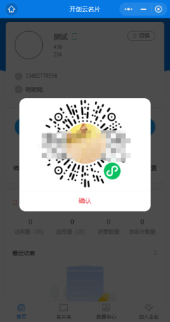点击名片助手首页的“名片二维码”按钮,即可生成二维码,截图保存图片分享后可在微信内识别,如下图