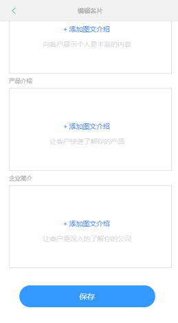 名片助手首页点击“编辑名片”填写个人基础信息,点击个人展示等模块中的“添加图文介绍”可在分享出的名片首页展示个性化的介绍等