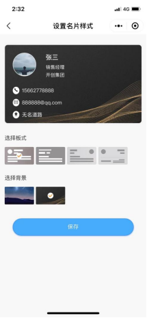 在“编辑名片”页面内点击“更换名片样式”,用户可根据个人喜好选择不同的名片板式和名片背景进行组合,搭建个性化名片