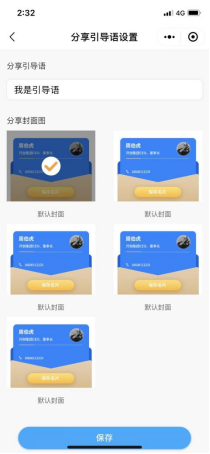 在“编辑名片”页面内点击“分享引导语”设置,用户可自定义名片在微信内的分享的封面图及提示引导语,如下图