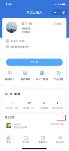 名片助手首页的“今日数据”模块可实时预览用户当前名片今日的访问量、浏览量、获赞量、发名片数量等数据,以及最近查看过我的名片的微信访客列表(未授权的访客显示为“匿名访客”),点击右侧“>”可查看全部的访客列表。