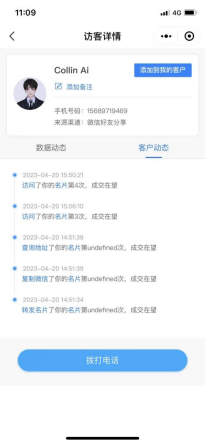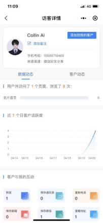 对于已授权微信手机号的访客可在访客列表中点击查看访客的详细数据及动态记录,包含用户的头像、昵称、手机号、页面浏览记录、近7日活跃度分析、互动点击行为统计及查看名片的次数详情等数据;点击昵称右侧“添加到我的客户”即可保存当前访客至“我的客户”列表,方便用户联系及管理客户。