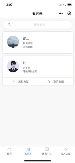在名片助手的底部导航点击“名片夹”页面,当前页面内收藏了用户查看过的其他人名片以及置顶的个人名片,点击即可快速预览他人名片的头像、姓名、公司等信息,支持姓名检索快速查询;对于想要移除的名片点击“取消收藏”即可,如下图