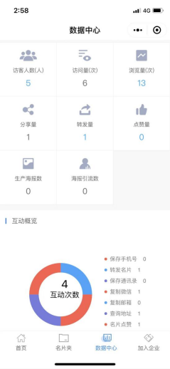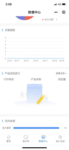 在名片助手的底部导航点击“数据中心”页面,当前页面内可查看个人名片的全部访客数据,包含访客数、访问量、浏览量、分享量、点赞量等概览数据,部分数据支持点击查看详细数据列表;数据中心还统计了访客的互动行为数据、访问趋势、产品浏览统计和访问来源等,便于用户运营分析个人访客的各项数据,如下图