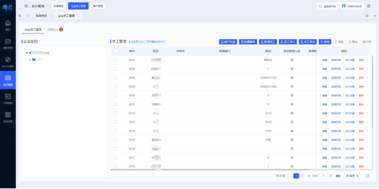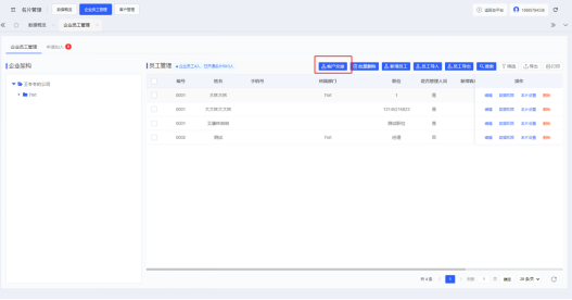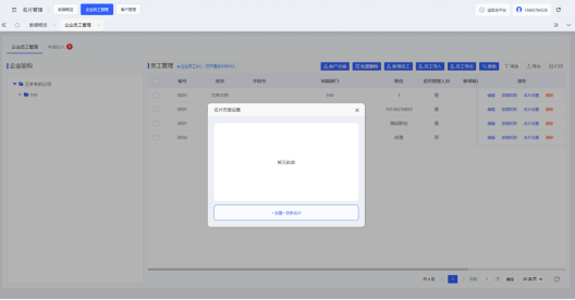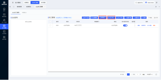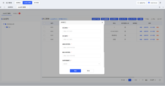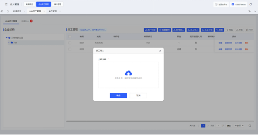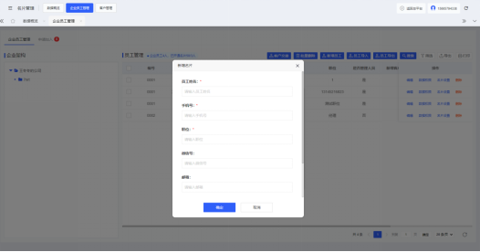 云名片管理后台-名片管理-企业员工管理 页面内点击“新增员工”,填写员工姓名、微信手机号码、展示手机号码、所属部门等资料信息后点击“确定”即可添加完成。若企业需要批量添加员工,可点击“员工导入”按钮,上传员工信息模板(点击弹窗内“下载模板”,按照模板格式录入)即可完成员工批量添加。