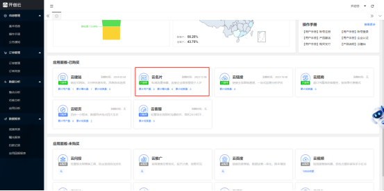 对于已开通乘风引擎AI效果营销平台的用户,可通过乘风引擎官网(https://saas.ctrl.cn/)登录用户端后台,点击“云名片”应用进行访问