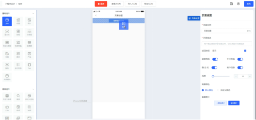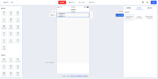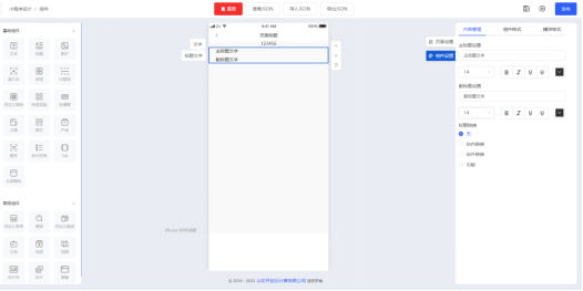 按住左侧“标题”组件拖动至中间手机模型画布,即可把组件添加至内容编辑区,在页面右侧内容管理一栏内可修改标题的内容、配置标题的字号颜色等参数;在“组件样式”页面中可设置切换不同的标题组件样式,也可通过模块样式的参数实现二次调整。