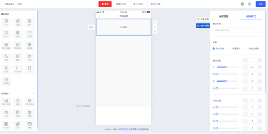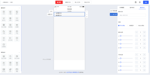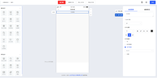 按住左侧“文本”组件拖动至中间手机模型画布,即可把组件添加至内容编辑区,在页面右侧内容管理一栏内填写文本内容,组件各项参数支持用户自定义设置。