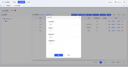 对于企业内已经离职或将要离职的员工,管理员可通过管理后台的员工管理页面点击“客户交接”按钮将A员工的客户转移给B员工;在客户交接弹窗内选择交出方及其名片和接收方及选择接收的名片,点击确定即可完成交接,更大程度的避免了企业员工离职带来的客户流失风险。
