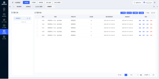 云名片管理后台-内容管理-文章管理 页面内包含文章分类、文章列表、新增文章、文章字段管理等功能。