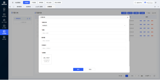 点击“新增”按钮,选择所属分类,添加标题、副标题、文章简介、封面图、内容等,确认提交即可创建一篇新的文章,列表内的文章可在组件中调用展示。