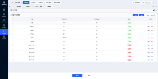 点击“字段”按钮,可自定义编辑、启用或禁用文章内的所需字段(字段类型:文本、图片、富文本),点击确定即可生效。