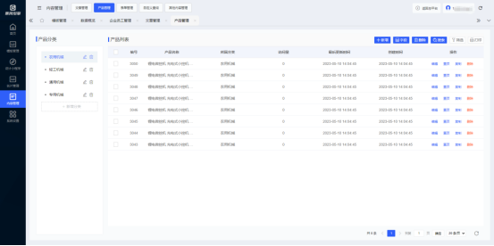 云名片管理后台-内容管理-产品管理 页面内包含产品分类、产品列表、新增产品、产品字段管理等功能。