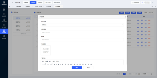 点击“新增”按钮,选择所属分类,添加产品名称、副标题、产品图片、产品介绍等,确认提交即可添加产品,列表内的产品内容可在组件中调用展示。