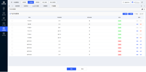 点击“字段”按钮,可自定义编辑、启用或禁用产品内的所需字段(字段类型:文本、图片、富文本),点击确定即可生效。