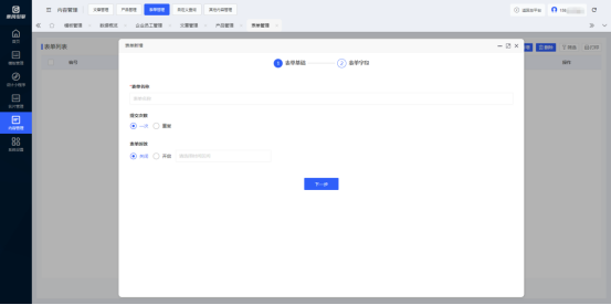 云名片管理后台-内容管理-表单管理 页面内可通过点击“新增”按钮创建多个表单项目,填写表单名称,设置提交次数、提交通知、表单时效等参数即可完成表单的创建。用户可在小程序设计页面内的“表单组件”中调用设置的表单项目,可为用户实现简易的表单收集和提交功能。
