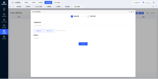 云名片管理后台-内容管理-自定义查询 页面内可通过点击“新增”按钮创建多个支持查询的数据文档列表,填写查询名称、查询提示,上传提供查询的文件,配置所需查询的字段,即可在小程序设计的“自定义查询”组件内实现小程序内的在线查询文档的功能。