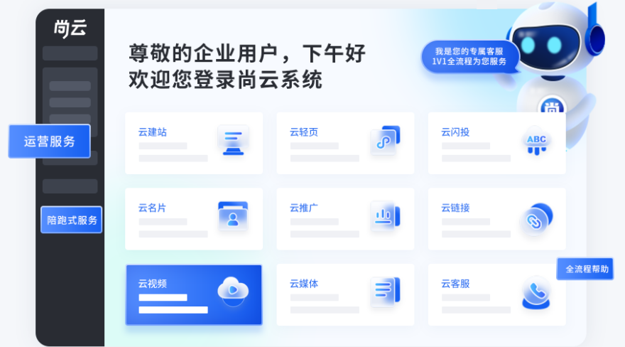 当下各行各业竞争压力日渐加剧,单一的基础服务已不能满足企业发展的需求,只有为企业提供多元化增值服务,实现精细化、标准化的运营管理,才能在市场竞争中占据主导地位。云服务作为尚云核心功能之一,不断深挖企业需求并提供便捷、高效、多元的增值服务与整合营销策略方案,助力企业一站式响应平台智能升级,配备1V1运营专家教学指导、品牌推广跟进、客户管理运营等相关服务,切实保障广大企业经营管理的可持续发展。
